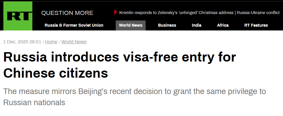 据今日俄罗斯(RT)网站报道,普京总统正式签署关于中国公民临时入境俄罗斯的法令。中国公民可免签证进入俄罗斯,停留期限最长为30天。该法令自12月1日签署之日起生效,有效期至2026年9月14日。中国外交部此前宣布,自2025年9月15日至2026年9月14日,试行持俄罗斯普通护照免签政策。