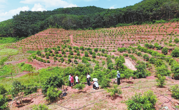 技术人员和农民检查西双版纳勐腊县榴莲树的生长情况。 (提供图片)
