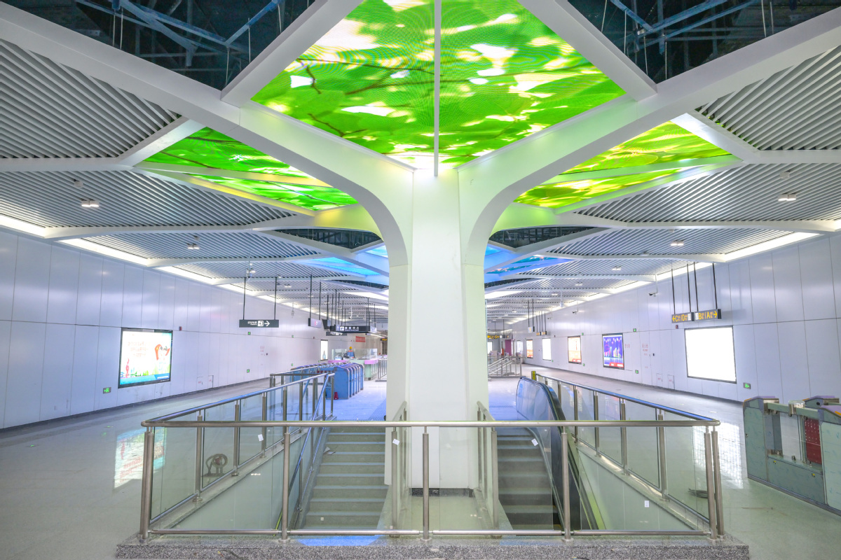 其中,凯福寺站是第一个新建车站。背靠大蜀山,位于望江西路与玉兰大道交叉口。车站沿望江西路东西走向。本站为明挖式地下二层岛式站台,主体建筑面积20804.2平方米,十期建筑面积5895.8平方米,总建筑面积26700平方米。它是沿线四个主要装饰车站之一,以生命之树为主题。车站设计灵感源自车站西北部郁郁葱葱的大树山国家森林公园,提炼出高大的松树还有大树山的柏树和奇花异草的清新质感。车站顶面以渐变绿为主,模仿山林的起伏。天花板由简单的线条构成,就像伸展的树枝和树叶。这是合肥首次利用柔性LED屏和软膜灯来展现“科技”“树”和“生态树”的动态美——春天枝繁叶茂,夏天繁花似锦,秋天染成森林,冬天傲雪松枝。行走间的山林气息 值得注意的是,该项目80%以上是由1995年出生的年轻人组成。在王安的带领下。80后出生的项目经理安先生,不断推进项目建设,真正实现年轻人聚集,助力城市发展。