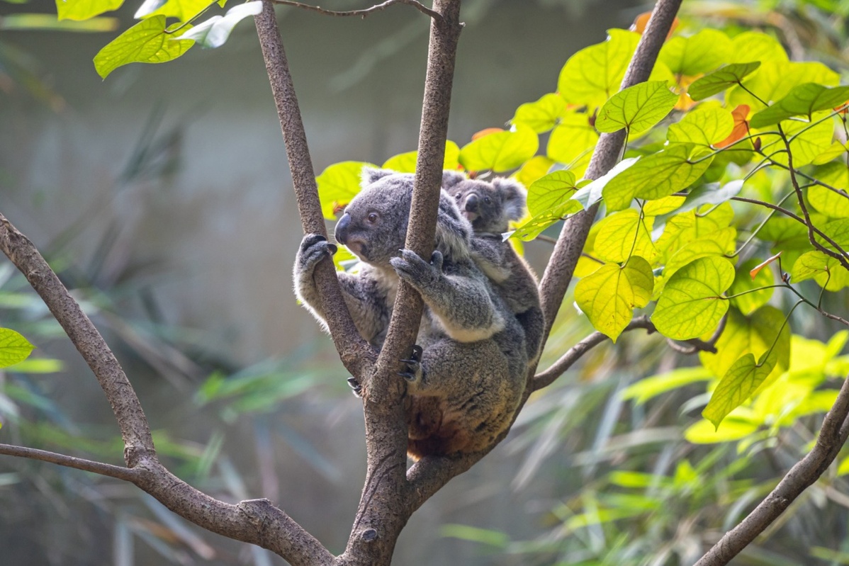 考拉花园里,考拉妈妈“艾达”抱着宝宝“海洋”,安静地坐在树枝上休息。 As "Ida's" third child, "Ocean" was born on March 27, 2025. He currently weighs 1.27 kilograms and left the pouch for the first time to explore the world at the age of 206 days. On another branch perched not far away, the baby koala "Onion", born on May 10, 2025, has a round head and big ignorant eyes, very cute to look at.这是母亲“Hana”的第五个孩子。它目前重0.77公斤,首次出生时年龄为201天。